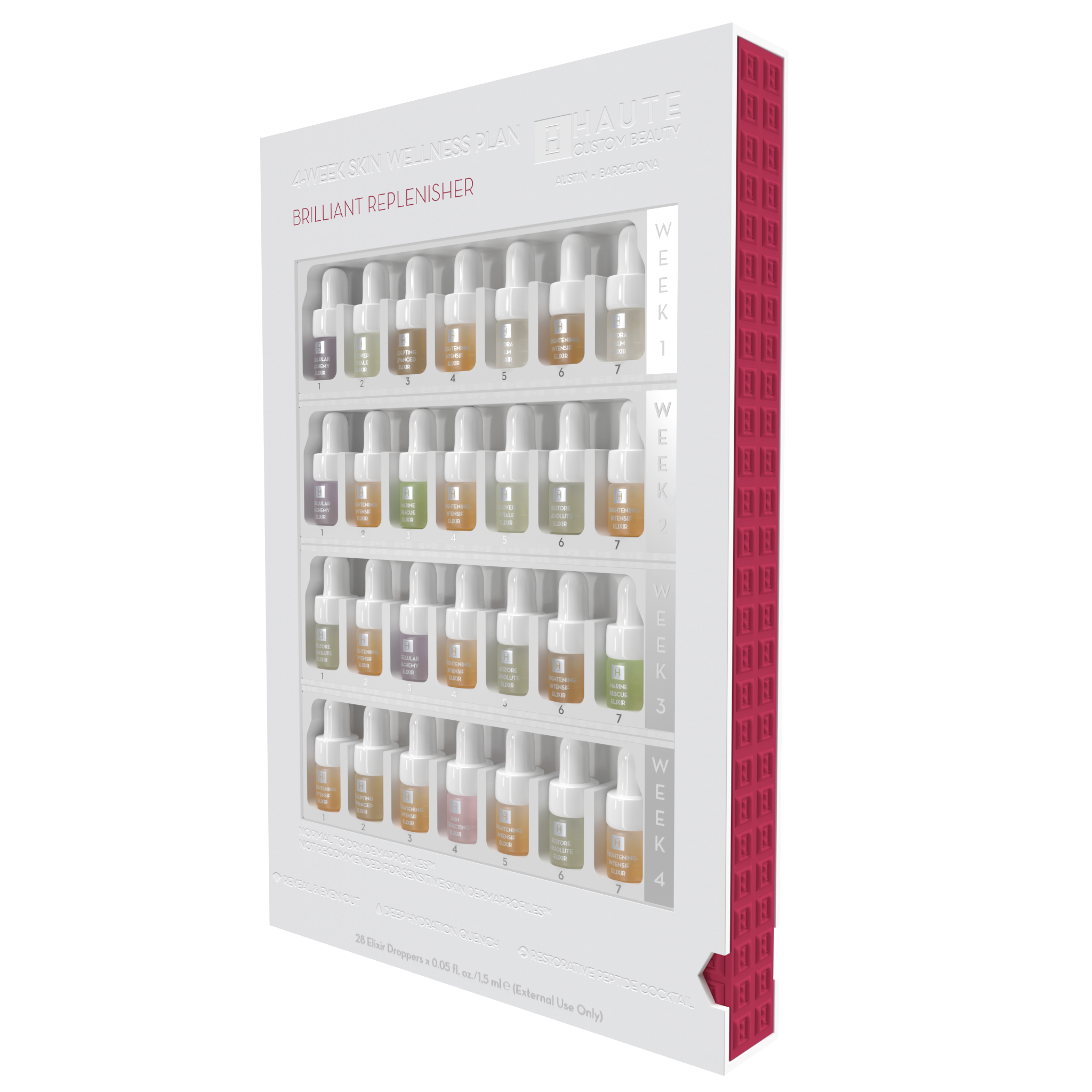 The application of different Elixirs throughout the skin cell lifecycle of four weeks, personalized for specific skin’s needs, provides for multi-faceted, synergistic results much in the same manner as a professional trainer takes the body throughout guided, personalized workouts targeting different muscle groups, stretches and cardio, or a nutritionist who creates a balanced diet with a varied, but personalized, combination of nutrients.