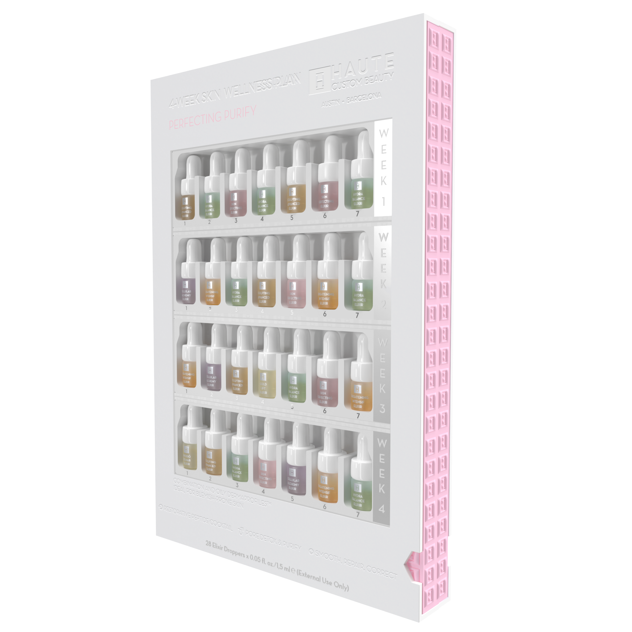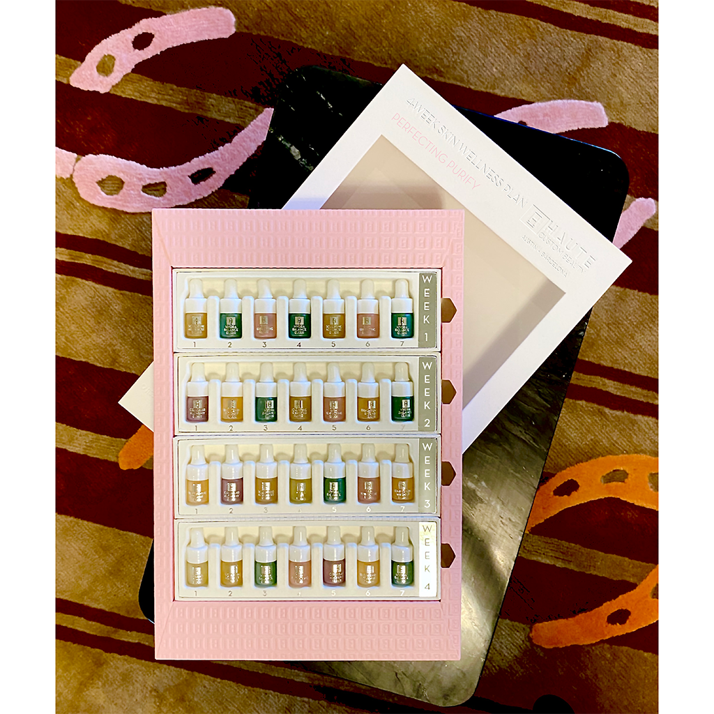 The application of different Elixirs throughout the skin cell lifecycle of four weeks, personalized for specific skin’s needs, provides for multi-faceted, synergistic results much in the same manner as a professional trainer takes the body throughout guided, personalized workouts targeting different muscle groups, stretches and cardio, or a nutritionist who creates a balanced diet with a varied, but personalized, combination of nutrients.
